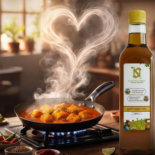 Experience the purity of Sukh Naturals Cold Pressed Mustard Oil. Sun-dried and unrefined, this 100% natural, nutrient-rich oil supports heart health and digestion while offering authentic, traditional flavor.